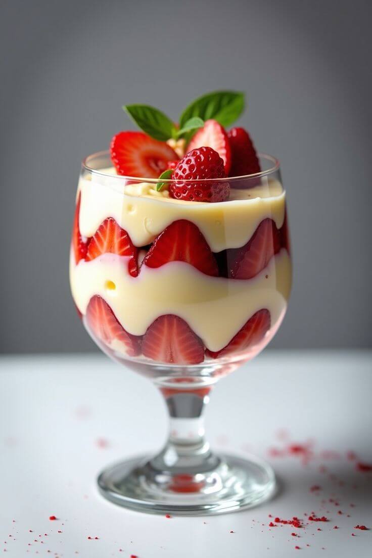 Capas de crema, fresas y salsa dulce en una presentación elegante. Refrescante y perfecta para consentirte
